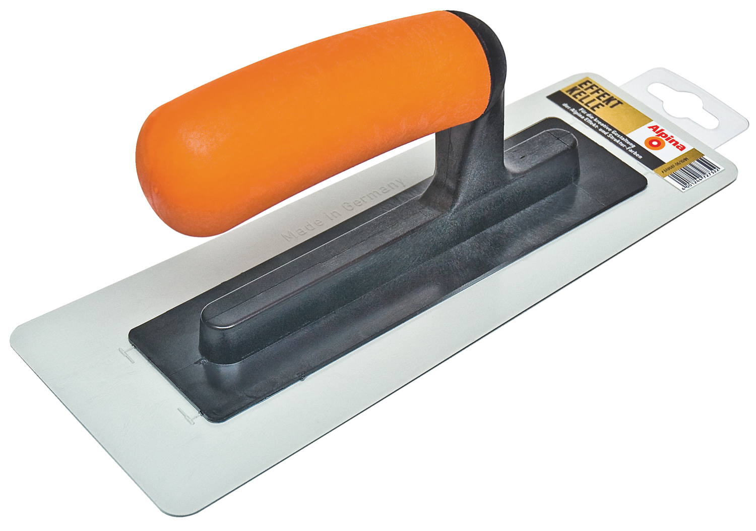 Специальная кельма Alpina Effekt-Kelle идеально подходит для нанесения и структурирования более толстых слоев наполненных материалов, таких, как краска с эффектом мрамора — Alpina Marmor Effekt, бетона — Alpina Beton Effekt или структурным эффектом — Alpina Struktur Effekt. Гибкое полотно кельмы с закругленными краями намного упрощает нанесение материалов на стены.