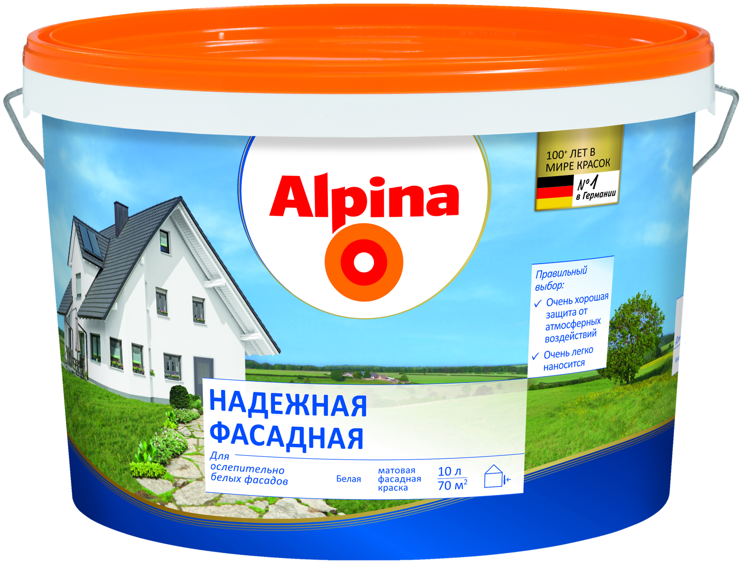 Alpina Надежная фасадная — это матовая дисперсионная краска, поражающая, прежде всего, своей высокой укрывистостью и невероятной простотой в нанесении.