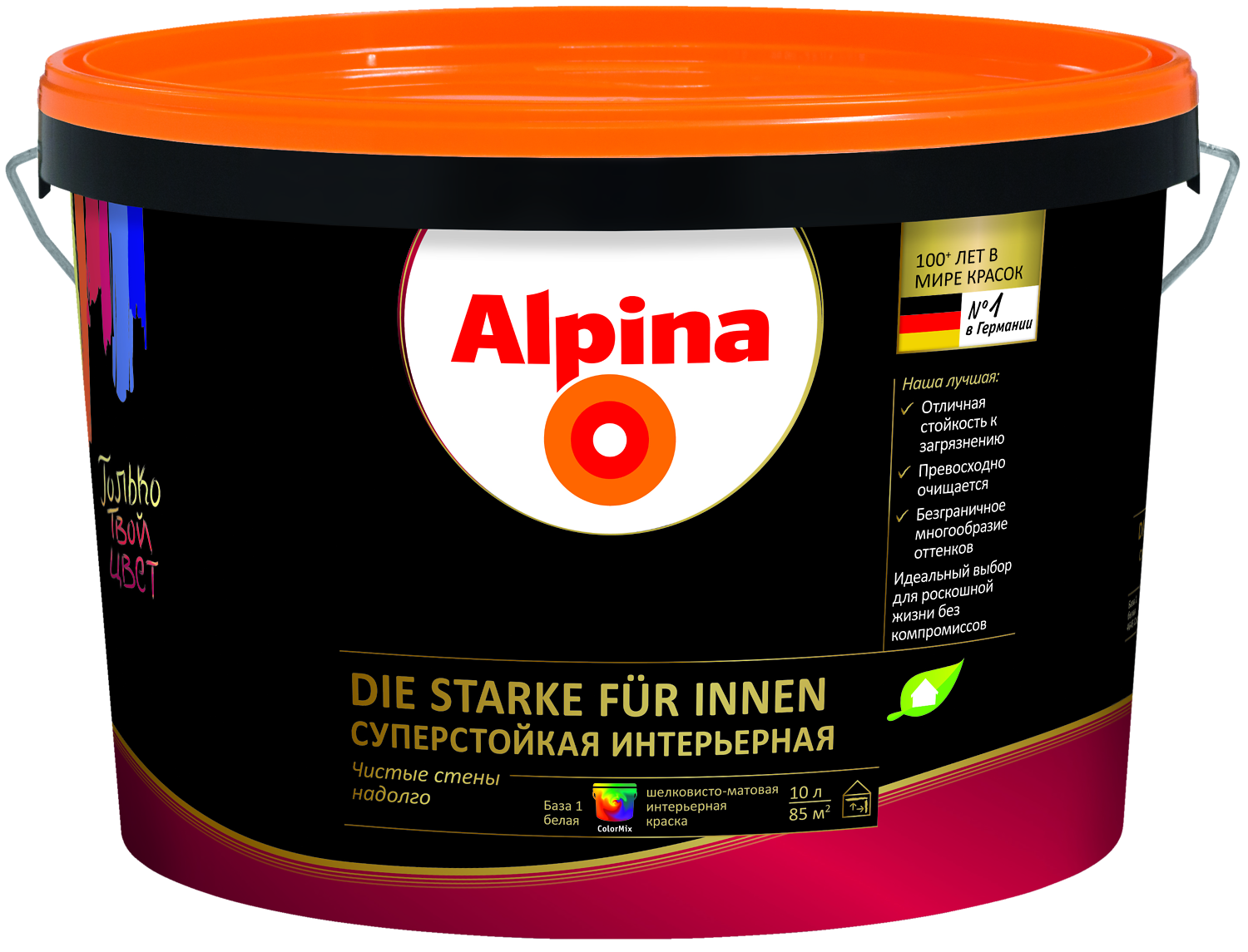 Alpina Die Starke für Innen — это идеальное решение для осуществления Вашей мечты о домашнем уюте . Эта шелковисто-матовая и грязеотталкивающая дисперсионная краска предлагает Вам безграничный выбор цветовых оттенков и может наноситься практически на любые основания.