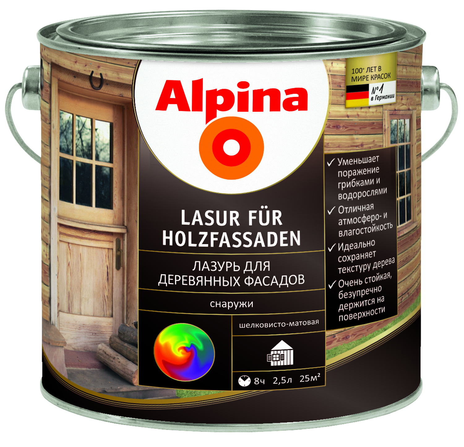 Устойчивая к воздействию ультрафиолета, водоотталкивающая и ""дышащяя"" лазурь обеспечивает идеальную атмосферостойкость и влагостойкость. Все это надолго защищает деревянные фасады, предупреждая их разрушение и уменьшает вероятность поражения грибками или водорослями. Высокое качество Alpina Lasur für Holzfassaden препятствует расслаиванию поверхности фасада и заботится о его долговечности. К тому же, лазурь отличает очень слабый запах как при ее нанесении, так и при ее быстром высыхании. Кроме того, Alpina Lasur für Holzfassaden колеруется в любые оттенки дерева в соответствии с Вашими индивидуальными предпочтениями, что обеспечивает широчайшую свободу выбора в оформлении Вашего дома.