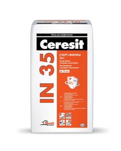 Шпатлевка Ceresit IN 35 предназначена для высококачественной подготовки бетонных, цементно-известковых, цементно-песчаных, гипсовых и др. Оснований под отделку. Рекомендуется для выравнивания неровностей и выбоин глубиной до 10 мм на поверхности стен и потолков, для заполнения швов и стыков гипсокартонных плит. Материал образует прочное и устойчивое основание под оклейку обоями, позволяет добиться гладкой, лёгкой для окраски поверхности. Для заполнения больших трещин, отверстий, крепления электропроводки, заделки глубоких швов необходимо использовать полимерминеральную шпатлевку Ceresit CT 29 или быстротвердеющую смесь Ceresit CХ 5. Для устройства тонких шпатлевочных покрытий (1-2 мм), подготовки поверхности под высококачественную окраску рекомендуем использовать готовую к применению финишную полимерную шпатлевку Ceresit IN 46.