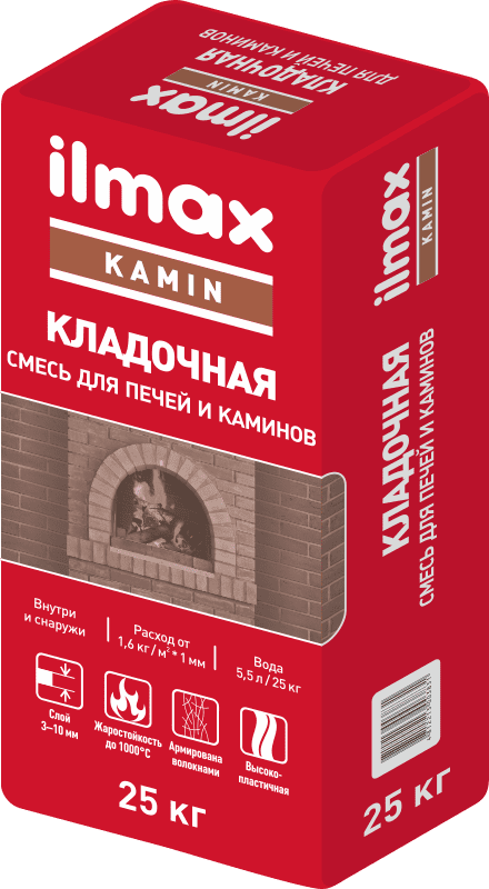 ilmax kamin кладочная предназначена для кладки печей, каминов, барбекю, мангальных зон, тандыров и других конструкций, подверженных нагреву до 1000°С, выполняемых из шамотного (огнеупорного) и печного кирпича.