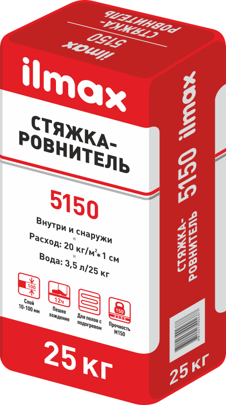 Растворная смесь сухая для стяжек, на цементном вяжущем, марки по прочности М150, марки по морозостойкости F75, марки по подвижности Пк2, группы по сохраняемости подвижности St-2: РСС для стяжек, цементная, М150, F75, Пк2, St-2 "ilmax 5150" СТБ 1307-2012