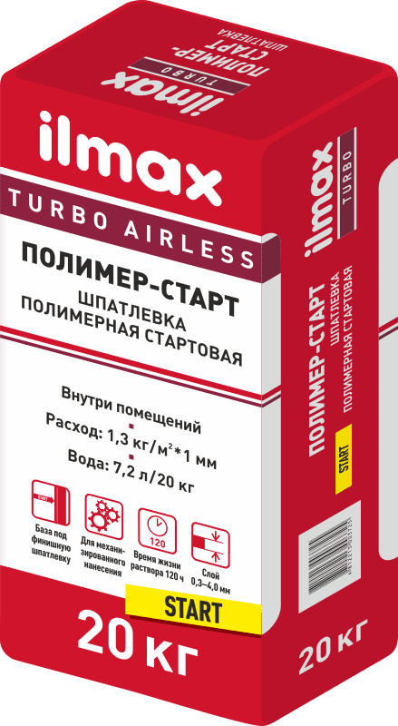ilmax turbo полимер старт предназначена для выравнивания шероховатостей, неровностей, заделки стыков гипсокартонных листов с использованием армирующей ленты, заполнения царапин, трещин, выбоин и других дефектов с целью получения ровной и гладкой поверхности стен и потолков под оклейку обоями или в качестве основания для финишных шпатлевок. Используется по минеральным поверхностям из бетона; цементным, цементно-известковым и гипсовым штукатуркам; гипсокартонным и гипсоволокнистым листам; гипсовым плитам. Состав: Полимерное связующее, минеральный наполнитель, модифицирующие и функциональные добавки.