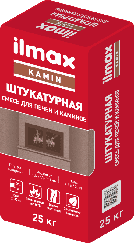 ilmax kamin штукатурная предназначена для оштукатуривания поверхностей печей, каминов, барбекю, мангальных комплексов, тандыров и других конструкций, подвергаемых нагреву и выполненных из шамотного (огнеупорного) и керамического кирпича, эксплуатируемых как внутри помещений, так и снаружи.
