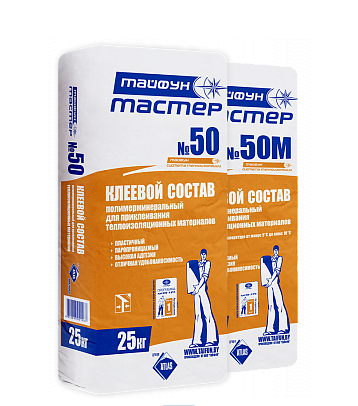 Клеевой состав «Тайфун Мастер» № 50 / «Тайфун Мастер» № 50М предназначен для приклеивания пенополистирольных и минераловатных плит в легкой и тяжелой штукатурных системах утепления зданий и сооружений «Тайфун».
