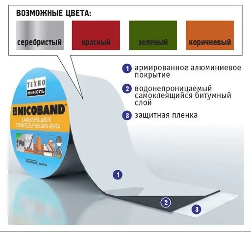 NICOBAND – это трехслойная лента-герметик. Верх изделия – это цветное покрытие, которое выполняет не только декоративную функцию, но и защитную – оно устойчиво к воздействию УФ-лучей. Средний слой ленты представляет собой самоклеющийся герметик. А нижний – защитная пленка: слой легко снимается перед началом работы. Самоклеющаяся лента NICOBAND имеет серебристый цвет. Ширина материала составляет 7,5 см, а длина – 10 м.