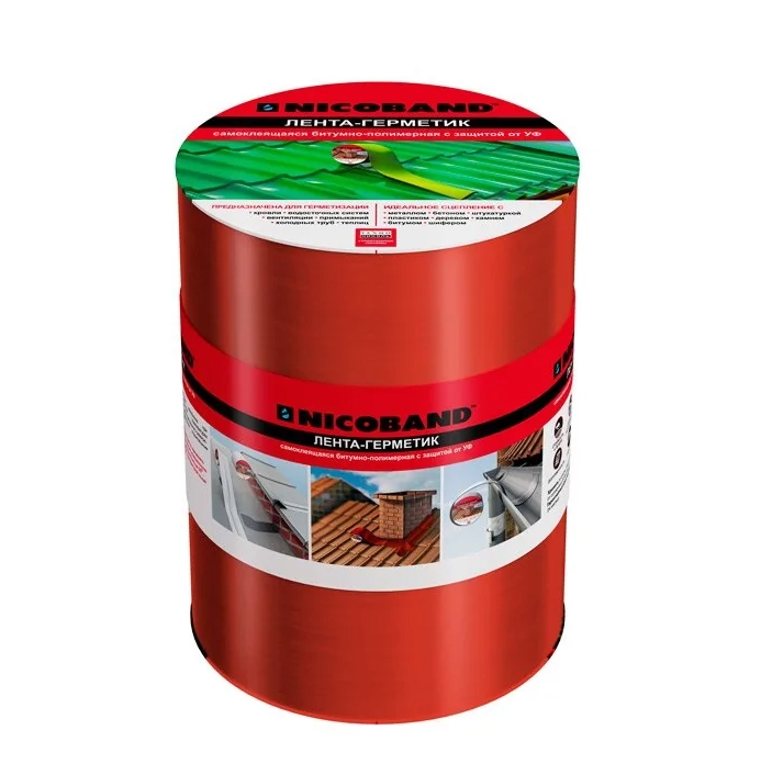 Ленту-герметик производства NICOBAND активно используют для устранения трещин на кровле, а также изоляции водосточных систем. Материал имеет отличный уровень сцепления: он подходит для работы со стеклом, деревом, бетоном, шифером.