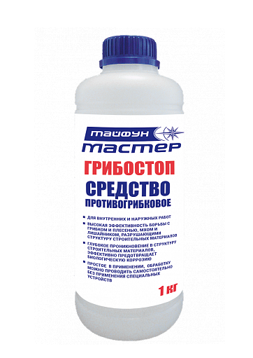 "Тайфун Мастер "ГРИБОСТОП" может применяться на всех видах типичных минеральных оснований таких, как бетон, кирпичная, газосиликатная, керамзитобетонная кладка, все виды выравнивающих и декоративных штукатурок, шпатлевок, на окрашенных поверхностях. Не рекомендуется для обработки древесины. Может применяться, как в новом строительстве, так и при ремонте и реставрации зданий и сооружений. Средство рекомендуется для обработки швов между керамическими плитками и плитками из натурального камня внутри и снаружи всех типов зданий и сооружений. Гарантировано уничтожает грибок класса Basidiomycetes, а также плесени: Aspergillus Niger, Aspergillus terrus, Paecilomyces variotti, Penicillium funiculosum, Penicillium ochrochloron, Scopulariopis brevicaulis, Trichoderma viride и их споры.