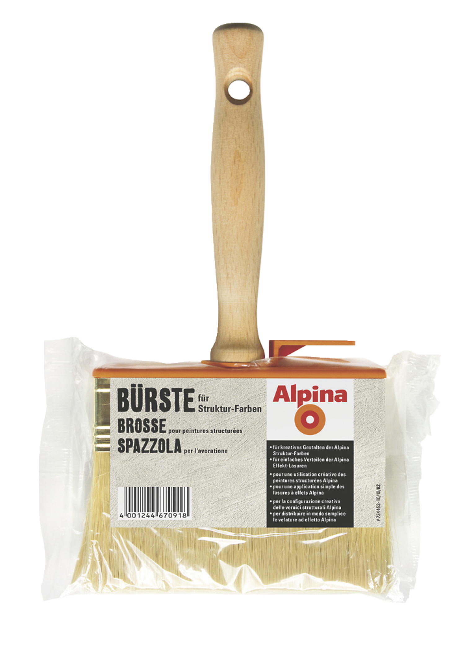 Кисть-макловица Alpina Bürste - это особая кисть для декоративного оформления при помощи красок с различными эффектами и структурных красок. Alpina Bürste идеально подходит для нанесения декоративных материалов из серии Alpina Effekt. Высококачественная щетина из полиэтилена обеспечивает оптимальное нанесение и соответствующий «щёточный» рисунок.