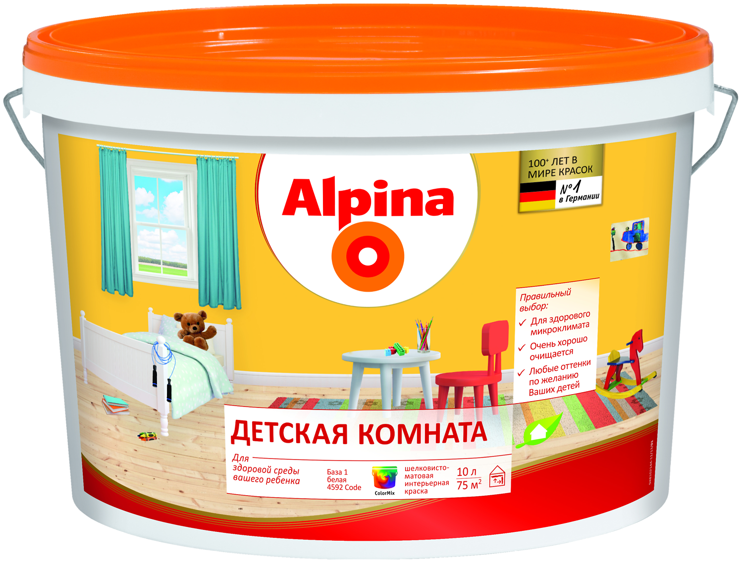 Кроме того, краска Alpina Детская комната даже после колерования не содержит вредных веществ и тем самым не оказывает вредного воздействия на воздух в помещениях и здоровье Вашего ребёнка.