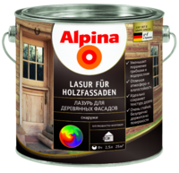 Устойчивая к воздействию ультрафиолета, водоотталкивающая и ""дышащяя"" лазурь обеспечивает идеальную атмосферостойкость и влагостойкость. Все это надолго защищает деревянные фасады, предупреждая их разрушение и уменьшает вероятность поражения грибками или водорослями. Высокое качество Alpina Lasur für Holzfassaden препятствует расслаиванию поверхности фасада и заботится о его долговечности. К тому же, лазурь отличает очень слабый запах как при ее нанесении, так и при ее быстром высыхании. Кроме того, Alpina Lasur für Holzfassaden колеруется в любые оттенки дерева в соответствии с Вашими индивидуальными предпочтениями, что обеспечивает широчайшую свободу выбора в оформлении Вашего дома.