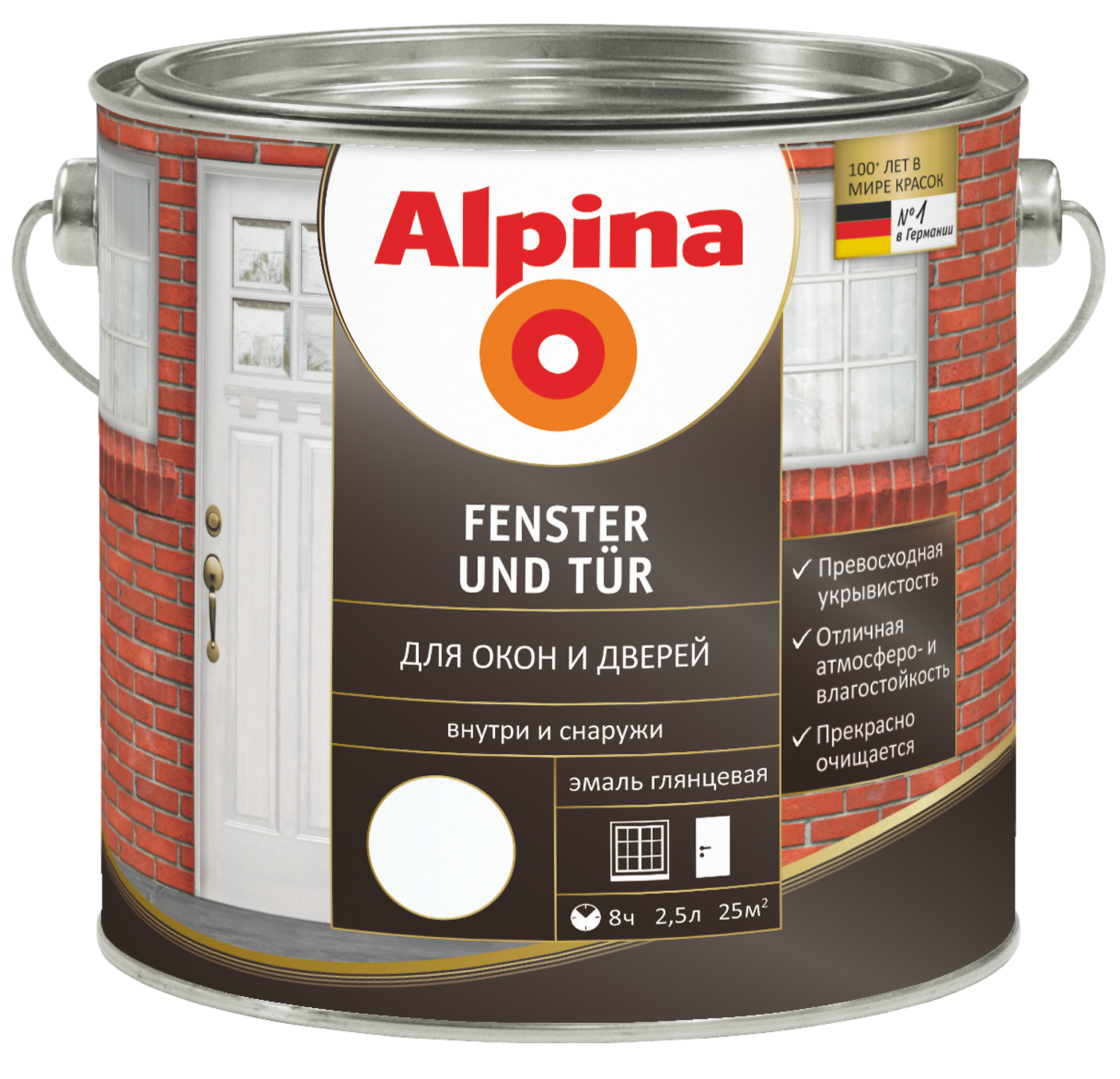 Защитите Ваши окна и двери от ветра, воздействий погодных условий и влаги, покрыв их идеально укрывистой алкидной эмалью. С эмалью Alpina Fenster und Tür Вы получите долговечные и прежде всего устойчивые к царапинам поверхности, устойчивые к сильным нагрузкам. Кроме того, Alpina Fenster und Tür заботится о создании легкой в уходе поверхности, которая легко очищается. Практически без запаха, приятно простая в использовании и быстро сохнущяя — Alpina Fenster und Tür можно использовать как для внешних, так и для внутренних работ.