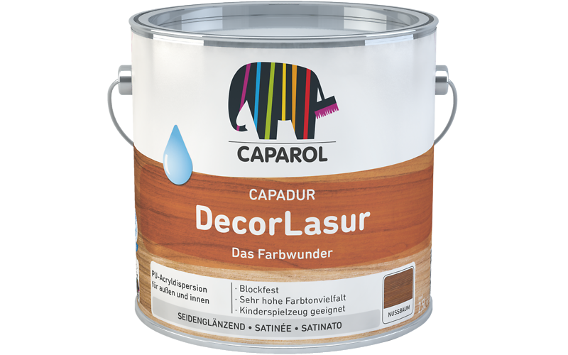 Некоторые цветовые тона условно подходят для наружного применения. Информацию об этом можно получить на станциях колеровки ColorExpress. Бесцветная лазурь Capadur DecorLasur применяется только в качестве грунтовки под цветную лазурь или как финишный слой на темную лазурь, т. к. иначе нельзя гарантировать достаточной защиты от ультрафиолетовых лучей. На внешних поверхностях, подверженных атмосферной коррозии, нельзя использовать бесцветную лазурь.
