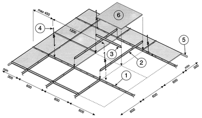 - Поперечные профили (2) и поперечно-секционные профили (3) закрепляются в несущих профилях (1) и формируют ячейки размером 600х600.
