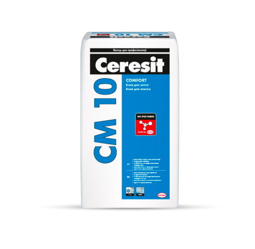 Клей для плитки Ceresit CM 10 предназначен для приклеивания керамических (глазурь и терракота) и цементных плиток размером до 40х40, а также внутри помещений для плиток грес (керамогранита) размером до 0,1 м2 (напр., 33*33 см) и стороной плитки до 40 см (напр., 40*25 см) на недеформирующихся поверхностях, таких как бетон, цементная стяжка, цементная и цементно-известковая штукатурка. Может применяться для кладки стен из газосиликатных и пенобетонных блоков. Клей для плитки Ceresit CM 10 может применяться как внутри, так и снаружи зданий. В случае деформирующихся оснований, таких как гипсокартонные плиты и плиты OSB, необходимо использовать Ceresit CM 16; для обогреваемых полов и по подплиточной гидроизоляции (продукты группы CL, CR) – Ceresit CM 14, СМ 16. При укладке плитки с водопоглощением менее 1% (например, керамогранит, грес) и размером более 0,1 м2 необходимо применять Ceresit CM 11 Plus, CM 12, CM 14, CM 16. Плитки из мрамора и других светлых крупнокристаллических пород, склонных к изменению цвета, необходимо укладывать с помощью Ceresit CM 115, CE 79 или CE 89.