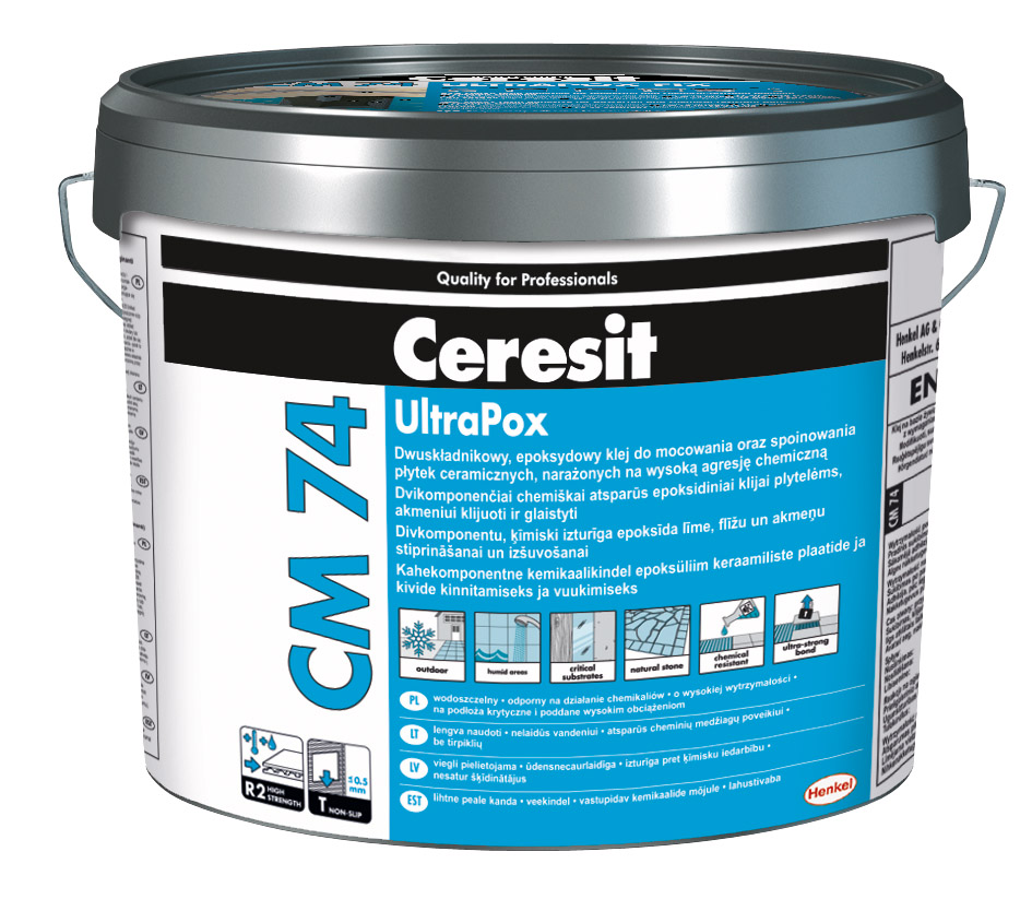 Смесь Ceresit CM 74 применяется для приклеивания облицовочной плитки и камня, кислотоупорного кирпича, дробленой плитки, ДСП, фарфора, клинкерной плитки и плиток на основе синтетической смолы (искусственный мрамор). Ceresit CM 74 также применяется для приклеивания и фугования керамических покрытий в зонах, подвергающихся агрессивному воздействию химических веществ (например, терапевтические ванные, молочное производство, общественные столовые, аккумуляторные, автомобильные мойки, пивоваренное производство, силосные ямы, животноводческие фермы, плавательные бассейны, лаборатории, спа-салоны, сауны и бани). Клей может применяться снаружи и внутри помещений, в местах постоянного воздействия влаги и может иметь контакт с питьевой водой.