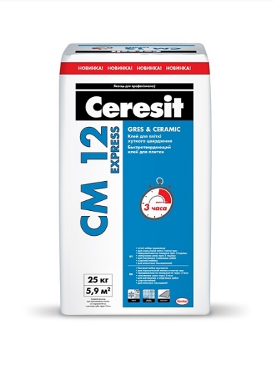 Ceresit СМ 12 EXPRESS предназначен для облицовки недеформирующихся оснований керамической, керамогранитной, цементной плиткой, изделиями из природного камня и т. п. Может использоваться на горизонтальных и вертикальных поверхностях Рекомендуется использовать для ремонта облицовки эксплуатируемых торговых залов, входных групп, фойе, коридоров и пр. мест с высокой проходимостью для сокращения сроков производства работ. Быстротвердеющие свойства позволяют использовать клей в холодное время года при температурах 0..5 °С и повышенной влажности, при условии сохранения положительной температуры воздуха и основания в течение 5..8 часов после начала производства работ. Для обогреваемых полов и по подплиточной гидроизоляции CR 166 необходимо использовать Ceresit CM 14, CM 16. Плитки из мрамора и других светлых крупнокристаллических пород, склонных к изменению цвета, необходимо укладывать с помощью Ceresit CM 115, CM 74.