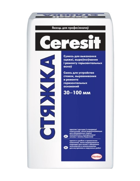 Стяжка Ceresit предназначена для устройства оснований и стяжек пола толщиной от 30 до 100 мм. Используется для ремонта горизонтальных цементных и бетонных оснований, скругления углов.Стяжка Ceresit имеет жесткопластичную консистенцию и позволяет формировать уклоны. Может применяться для устройства оснований под укладку керамических, керамогранитных и каменных плиток, а также ламината, ПВХ покрытий, ковролина и т.д., при обеспечении необходимой ровности поверхности и после дополнительного шлифования. На основания, выполненные из Стяжки Ceresit, могут быть вылиты самонивелирующиеся смеси, например, Ceresit CN 68, Ceresit CN 69. Может применяться для устройства обогреваемых полов, а также как внутри, так и снаружи зданий.