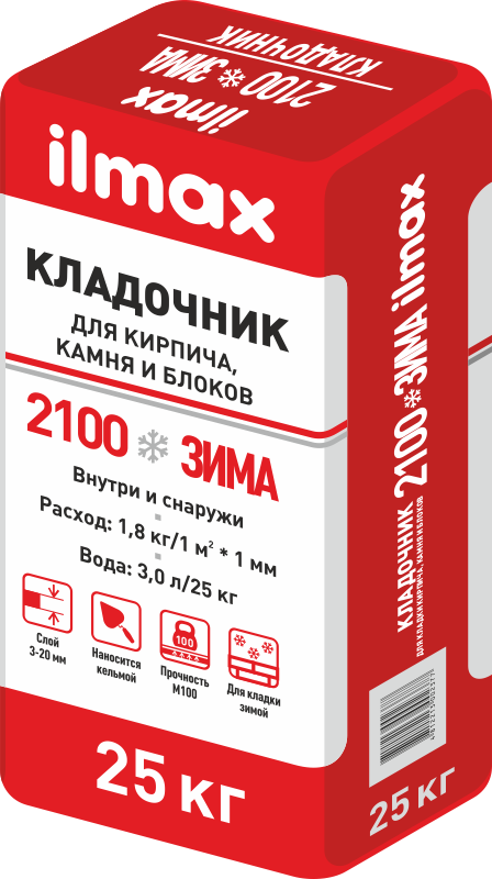 ilmax 2100 зима предназначен для кладки внутренних и наружных стен и перегородок из керамического и силикатного кирпича (камней, блоков), керамзитобетонных и ячеистобетонных блоков, ФБС, блоков вибропрессованных из тяжелого бетона, природного и искусственного камня, в том числе для выравнивания оснований под кладку первого ряда. Может применяться для устранения дефектов (выбоин, сколов) в кладке.
