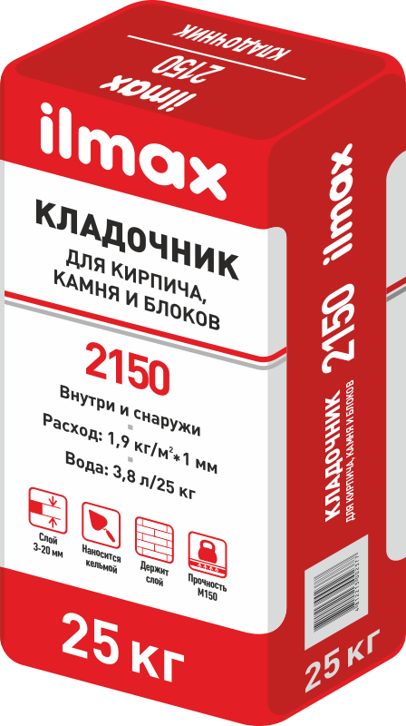 ilmax 2150 предназначен для кладки внутренних и наружных стен и перегородок из керамического и силикатного кирпича (камней, блоков), полнотелых керамзитобетонных блоков, ФБС, блоков вибропрессованных из тяжелого бетона, природного и искусственного камня, в том числе для выравнивания оснований под кладку первого ряда. ilmax 2150 следует использовать для кладки несущих и самонесущих конструкций из стеновых изделий пустотностью до 25%, марки по прочности на сжатие не менее М75, а также кладочных материалов с пустотностью более 25%, марки по прочности на сжатие не менее М150. Может применяться для кладки дымоходов, а также для устранения дефектов (выбоин, сколов) в кладке.