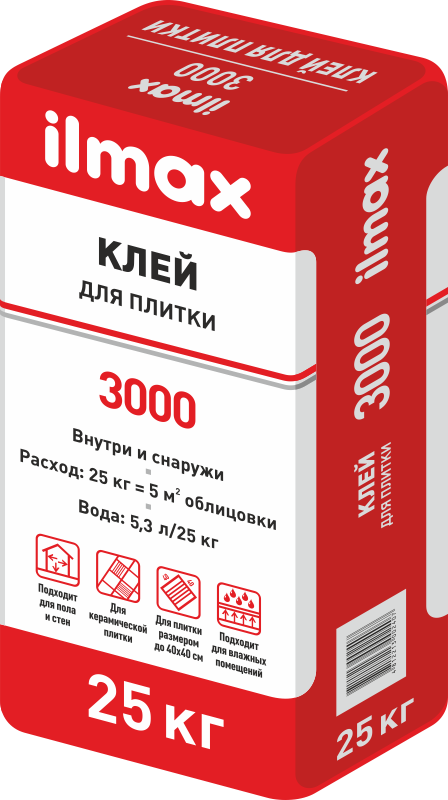 Растворная смесь сухая, клеевая облицовочная, на цементном вяжущем, марки по прочности М150, марки по морозостойкости F75, марки по консистенции К1, группы по сохраняемости консистенции St-4: РСС, клеевая облицовочная, цементная, М150, F75, K1, St-4 "ilmax 3000" СТБ 1307-2012
