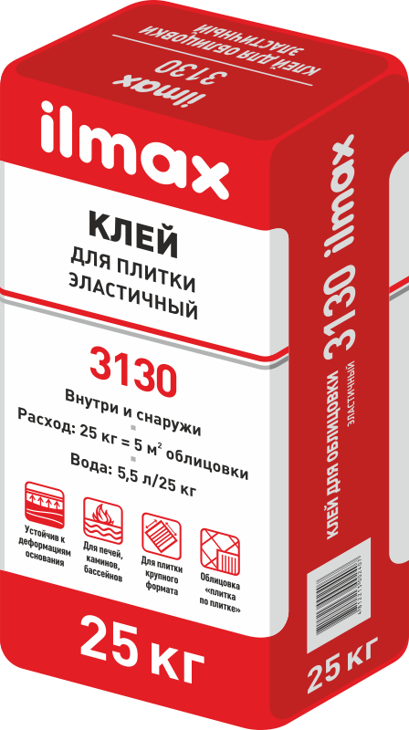 Плиточный клей ilmax 3130 предназначен для приклеивания: керамических (глазурованных и неглазурованных) плиток; плит из натурального камня* (кроме мрамора); клинкерных плиток; бетонных плиток; кислотоупорных плиток; непрозрачной стеклянной мозаики и мозаики из натурального камня* (кроме мрамора); плиток из искусственного камня*; плиток с водопоглощением менее 1%, в том числе, керамогранитных плиток (ГРЕС).