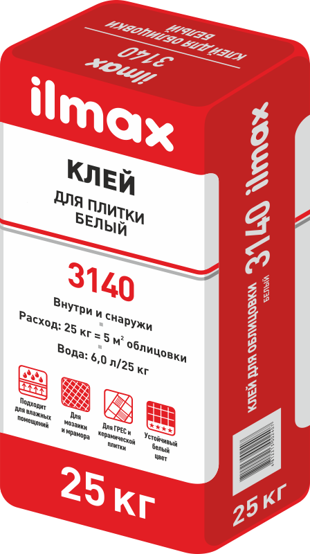 Плиточный клей ilmax 3140 предназначен для приклеивания: плитки из натурального и искусственного камня, в том числе мраморной; стеклянной плитки; мозаики; прозрачной, полупрозрачной, склонной к изменению цвета (прокрашиванию) плитки; керамической глазурованной и неглазурованной плитки, клинкерной плитки; плиток с водопоглощением менее 1%, в том числе, керамогранитных плиток (ГРЕС); АМК плитки.