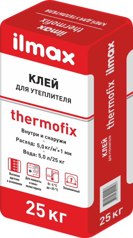 ilmax thermofix предназначен для приклеивания теплоизоляционных плит из минеральной ваты или пенополистирола в легких штукатурных системах утепления. Используется при утеплении новых и эксплуатируемых зданий на основаниях из кирпича, блоков, бетона, цементных и цементно-известковых штукатурок и других минеральных основаниях.