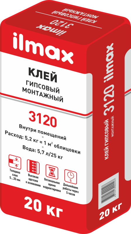 ilmax 3120 предназначен для приклеивания (монтажа): гипсокартонных листов (ГКЛ, ГВЛ, ГКП); стекломагнезитовых листов (СМЛ); гипсовых пазогребневых плит (ПГП). Используется на основаниях из следующих материалов: бетон, цементные, цементно-известковые, гипсовые штукатурки, кирпич и блоки из ячеистого бетона.