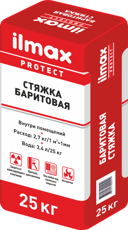 ilmax protect баритовая стяжка создана на основе баритового концентрата КБ-3 и предназначена для устройства горизонтального защитного слоя по ж/б перекрытиям или бетонным подготовкам.