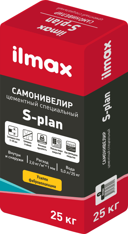 ilmax S-plan предназначен для выравнивания горизонтальных оснований из бетона и цементно-песчаных стяжек под различные виды напольных покрытий: ковролин, различные виды линолеума, плитка ПВХ, керамическая плитка, деревянные покрытия, ламинированные и пробковые полы, паркетная доска, специальные спортивные ПВХ и резиновые покрытия, наливные полиуретановые и эпоксидные полы, либо как финишное покрытие.