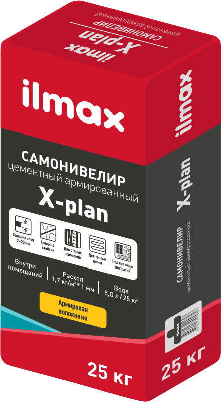 ilmax X-plan предназначен для выравнивания следующих оснований: бетона, в том числе старых мозаичных полов, цементно-песчаных стяжек, в том числе с подогревом; старой плитки, старых стяжек с поверхностными трещинами (с шириной раскрытия до 0,3 мм), сухих стяжек (плит OSB, ЦСП, ГВЛ, ДСП и др.). Используется для создания ровных оснований под различные виды напольных покрытий: ковровые и ПВХ покрытия, пробковые полы, ламинированные полы, паркетная доска, под облицовку различного рода плиток (керамическая плитка, плиты из природного и искусственного камня и др.). Самонивелир ilmax X-plan армирован волокнами. Трещиностойкий.