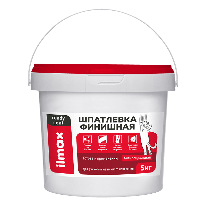Антивандальная (имеет высокую прочность и стойкость к истиранию). ilmax ready coat шпатлевка финишная готова к применению. Состав: дисперсия акрилового сополимера, минеральные наполнители, функциональные добавки, вода.