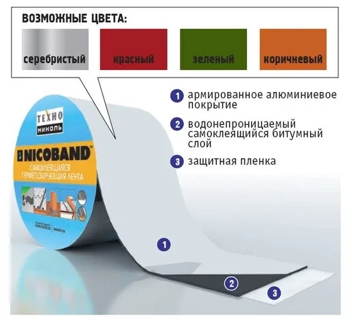 NICOBAND – это трехслойная лента-герметик. Верх изделия – это цветное покрытие, которое выполняет не только декоративную функцию, но и защитную – оно устойчиво к воздействию УФ-лучей. Средний слой ленты представляет собой самоклеющийся герметик. А нижний – защитная пленка: слой легко снимается перед началом работы. Самоклеющаяся лента NICOBAND имеет серебристый цвет. Ширина материала составляет 15 см, а длина – 3 м.